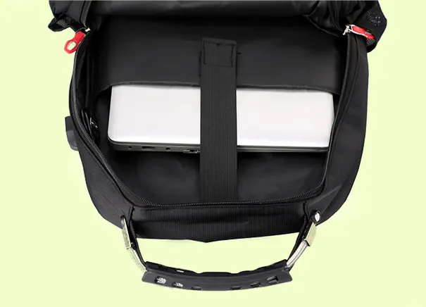 A luggage strap allows backpack fit on luggage/suitcase, slide over the luggage upright handle tube for easier carrying.